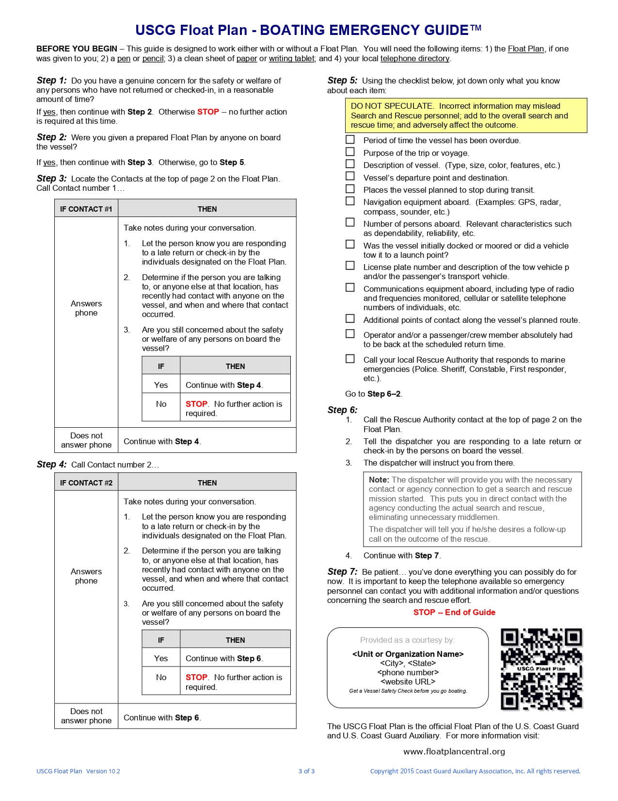 This means providing exact information to the friend or responsible person who has your float plan. This will include a number of who to call. If it’s the coast guard or rescue authorities, write down the exact number to call.